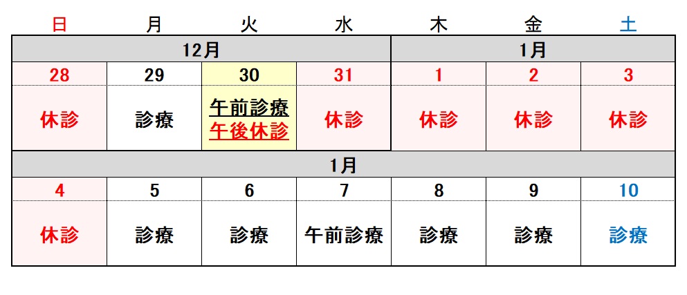 年末年始は 12月30日 (火) 午後 〜 1月4日 (日) の間、休診となります。